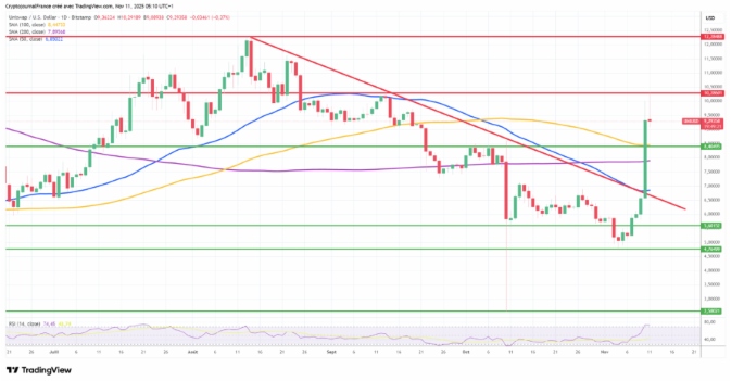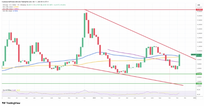 Teknik açıdan bakıldığında Uniswap grafiği, Pazartesi gününden beri güçlü yükseliş sinyalleri veriyor. En önemlisi, ağustos zirvesinden bu yana süren düşen trend çizgisi kırıldı.