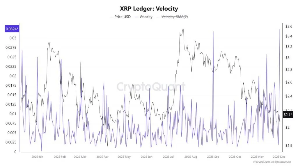 Birçok analist XRP coini yeni boğada en iyi kripto para adayları arasına koyuyor. CryptoQuant verilerine göre 2 Aralık’ta XRP Ledger üzerindeki Velocity metriği aniden fırladı.