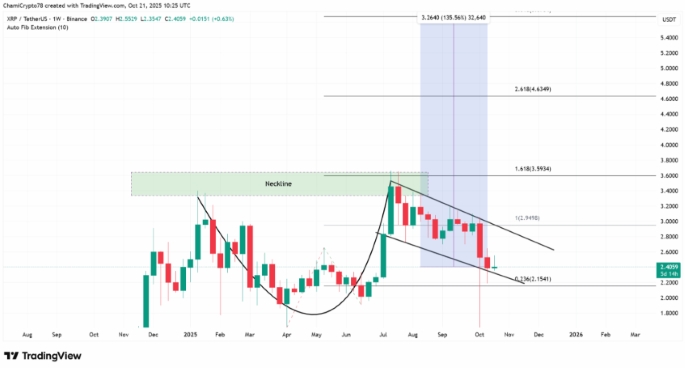 Bu seviyenin üzerinde gerçekleşecek güçlü bir kırılma, yüzde 135’lik yükselişi teyit eder. Böylece XRP fiyatı, Fibonacci uzantılarına göre 3,59 ve 5,6 dolara ulaşabilir. Şu anda XRP, 2,41 dolar seviyesinde işlem görüyor. Ayrıca 2,15 dolardaki 0,236 Fibonacci düzeltme seviyesinin üzerinde kalmayı başarıyor. Bu bölge, güçlü bir yapısal destek oluşturuyor.