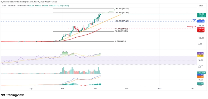 Eğer Zcash yükselişini sürdürürse, ralli 578,53 dolardaki yüzde 161,80 Fibonacci seviyesine uzanabilir.