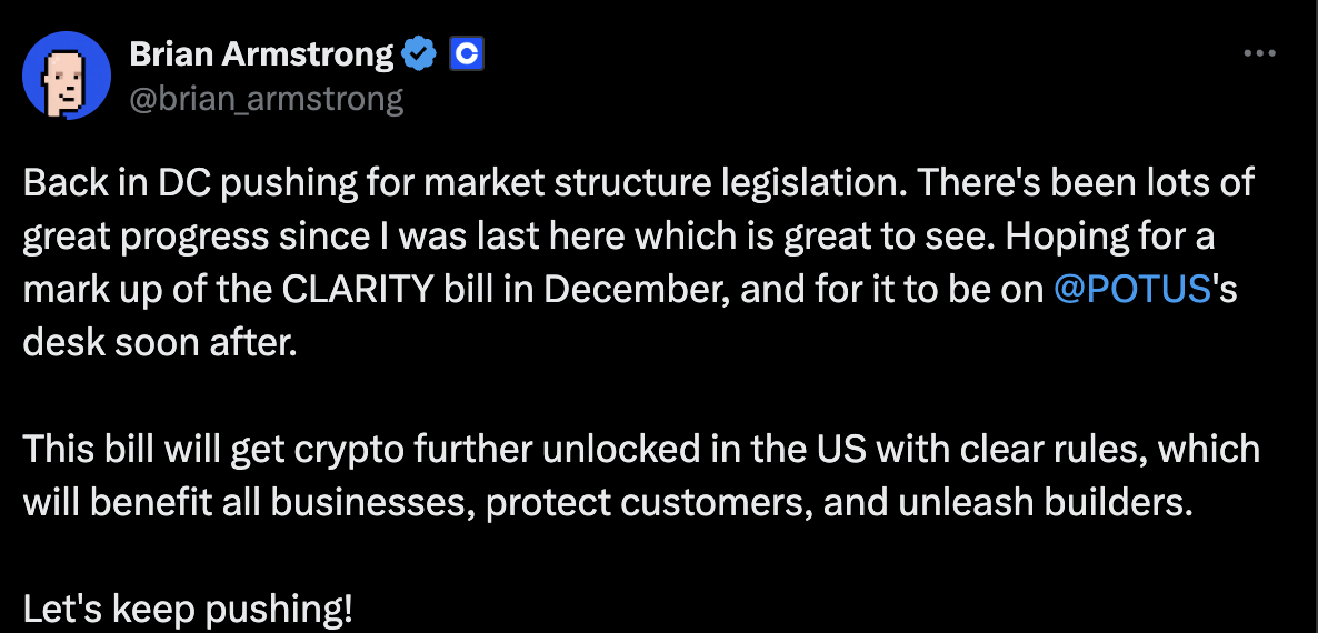 Leading from the front, Coinbase CEO Brian Armstrong is actively pushing for passage of federal crypto market structure legislation, noting “significant progress” since his last visit.